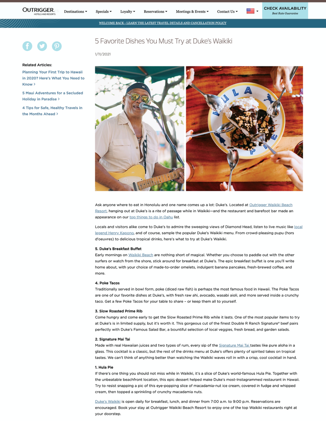Blog writing for various clients, including: Marriott Bonvoy Traveler, Kimpton Hotels & Restaurants, Outrigger Resorts.